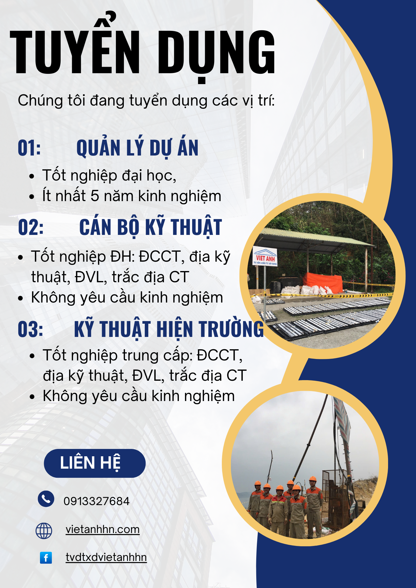 Công ty TNHH MTV Tư vấn & Đầu tư xây dựng Việt Anh Hà Nội thông báo cần tuyển nhân sự các vị trí sau: